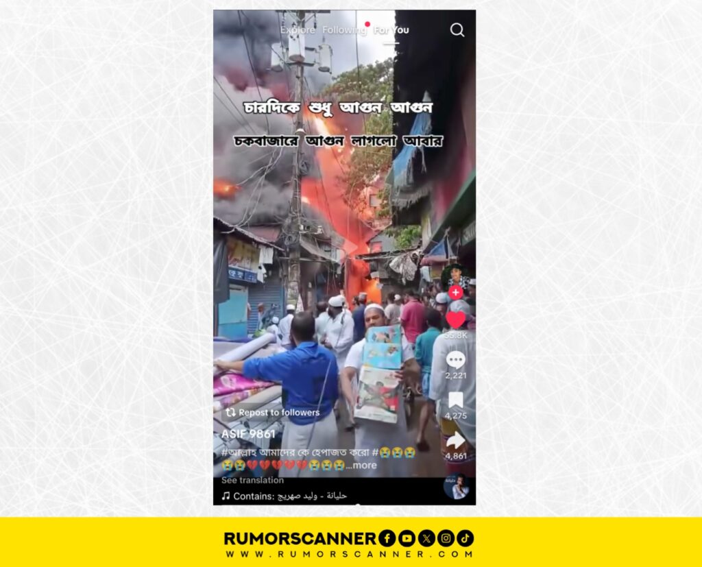 রিউমর স্ক্যানার টিমের অনুসন্ধানে জানা যায়, প্রচারিত ভিডিওটি সাম্প্রতিক সময়ের নয় এবং এটি চকবাজার নামে কোনো স্থানে আগুন লাগার দৃশ্যও নয়। প্রকৃতপক্ষে, গত জুলাইতে নরসিংদীর মাধবদী বাজারে অগ্নিকাণ্ডের দৃশ্য এটি।