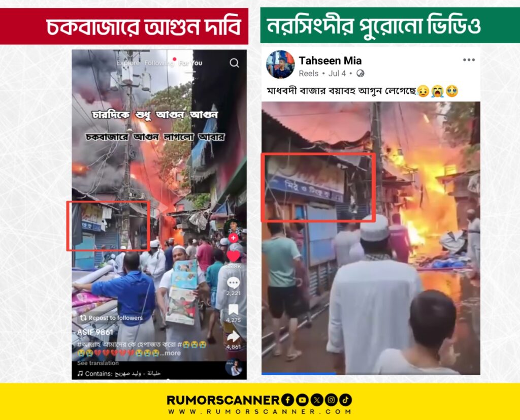 সুতরাং, গত জুলাইতে নরসিংদীর মাধবদী বাজারে আগুন লাগার দৃশ্যকে সম্প্রতি চকবাজারে আগুন লাগার ভিডিও দাবিতে প্রচার করা হচ্ছে; যা সম্পূর্ণ মিথ্যা।
