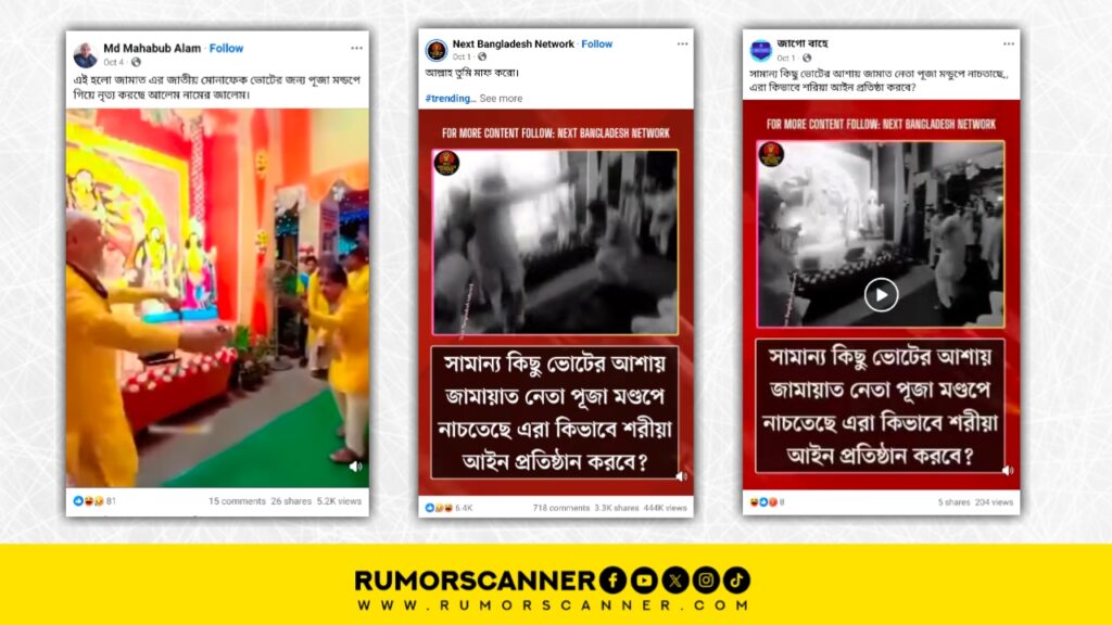 এ বছরের দুর্গাপূজায় বাংলাদেশ জামায়াতে ইসলামীর কথিত নেতাকর্মীরা পূজার মণ্ডপে নেচেছেন দাবিতে ‘সামান্য কিছু ভোটের আশায় জামায়াত নেতা পূজা মণ্ডপে নাচতেছে এরা কিভাবে শরীয়া আইন প্রতিষ্ঠা করবে?’ শীর্ষক শিরোনামে সামাজিক যোগাযোগ মাধ্যমে একটি ভিডিও প্রচার করা হয়েছে। প্রচারিত ভিডিওতে দাঁড়ি-টুপিওয়ালা একজন বয়স্ক ব্যক্তিকে দুর্গাপূজার মণ্ডপে অপর একজন ব্যক্তির সাথে নাচতে দেখা যায়।