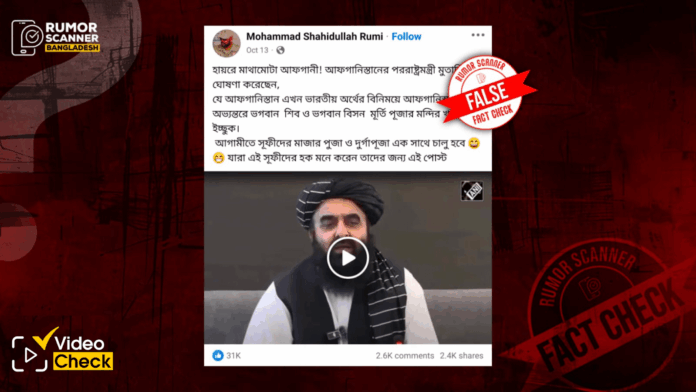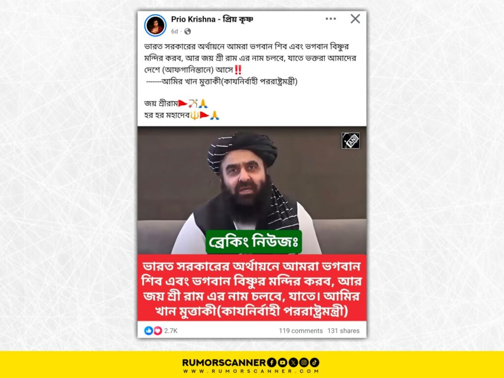 Through this video, it is being claimed that Muttaqi expressed his intention to build temples for Hindu deities Shiva and Vishnu in Afghanistan in exchange for financial assistance from India.