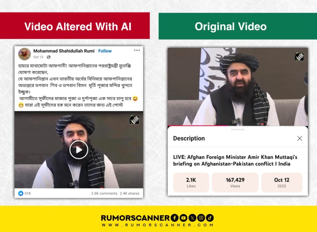 An investigation by the Rumor Scanner team found that the video circulated in Muttaqi’s name, claiming he spoke about building Hindu temples in Afghanistan, is not genuine. It is an AI-generated fake video.