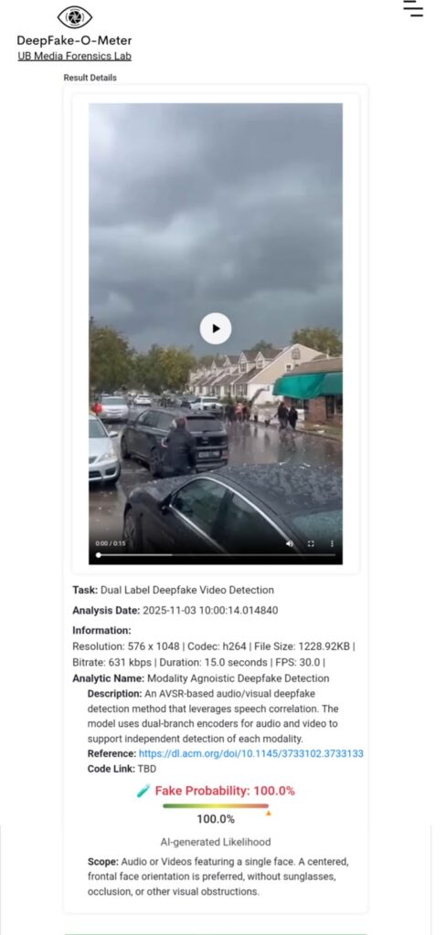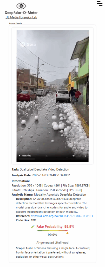 Although this video did not have the Sora watermark, given its similar nature, it was also tested on the ‘Deepfake-O-Meter’ AI and Deepfake content detection platform. The analysis showed that the platform’s ‘AVSRDD (2025)’ detector found a 100% probability that the video is fake or AI-generated.