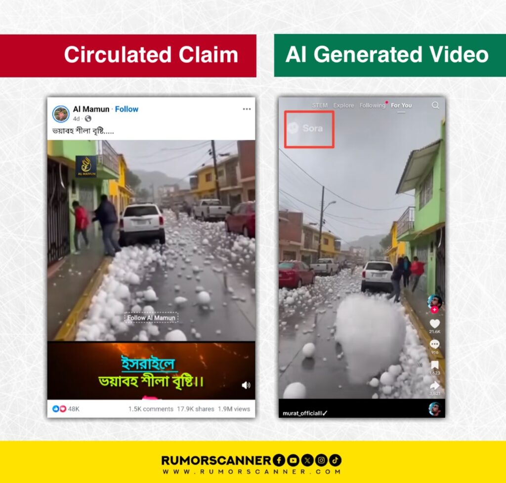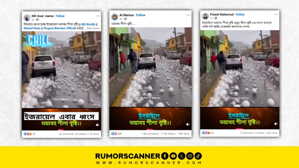 Rumor Scanner Team’s investigation found that the claim of a severe hailstorm in Israel is not true. Furthermore, the video circulated with this claim is also not real. In fact, a video created with the help of Artificial Intelligence (AI) technology has been promoted with the viral claim.