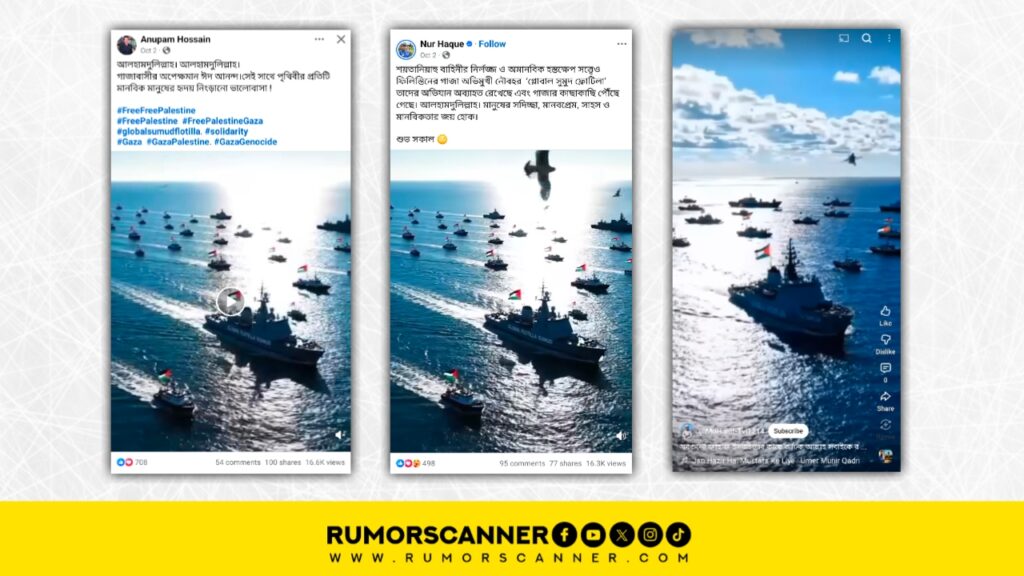 In protest of Israel’s ongoing illegal blockade of Gaza, the Global Sumud Flotilla, a naval initiative by international human rights activists to deliver aid, began its journey towards Gaza from Barcelona, Spain, on August 31. Subsequently, between September 13 and 15, more vessels carrying aid joined the fleet from Tunisia, the Italian island of Sicily, and the Greek island of Syros. However, due to Israeli obstruction, none of the ships in the said convoy were able to reach the Gaza Strip. In this context, a video has recently been circulated on the social media platform Facebook, claiming to be video footage of the Global Sumud Flotilla.