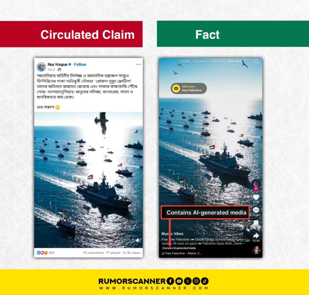 An investigation by the Rumor Scanner team found that the viral video claiming to be footage of the Global Sumud Flotilla is not real. In fact, a video created using artificial intelligence or AI technology has been circulated with the said claim.