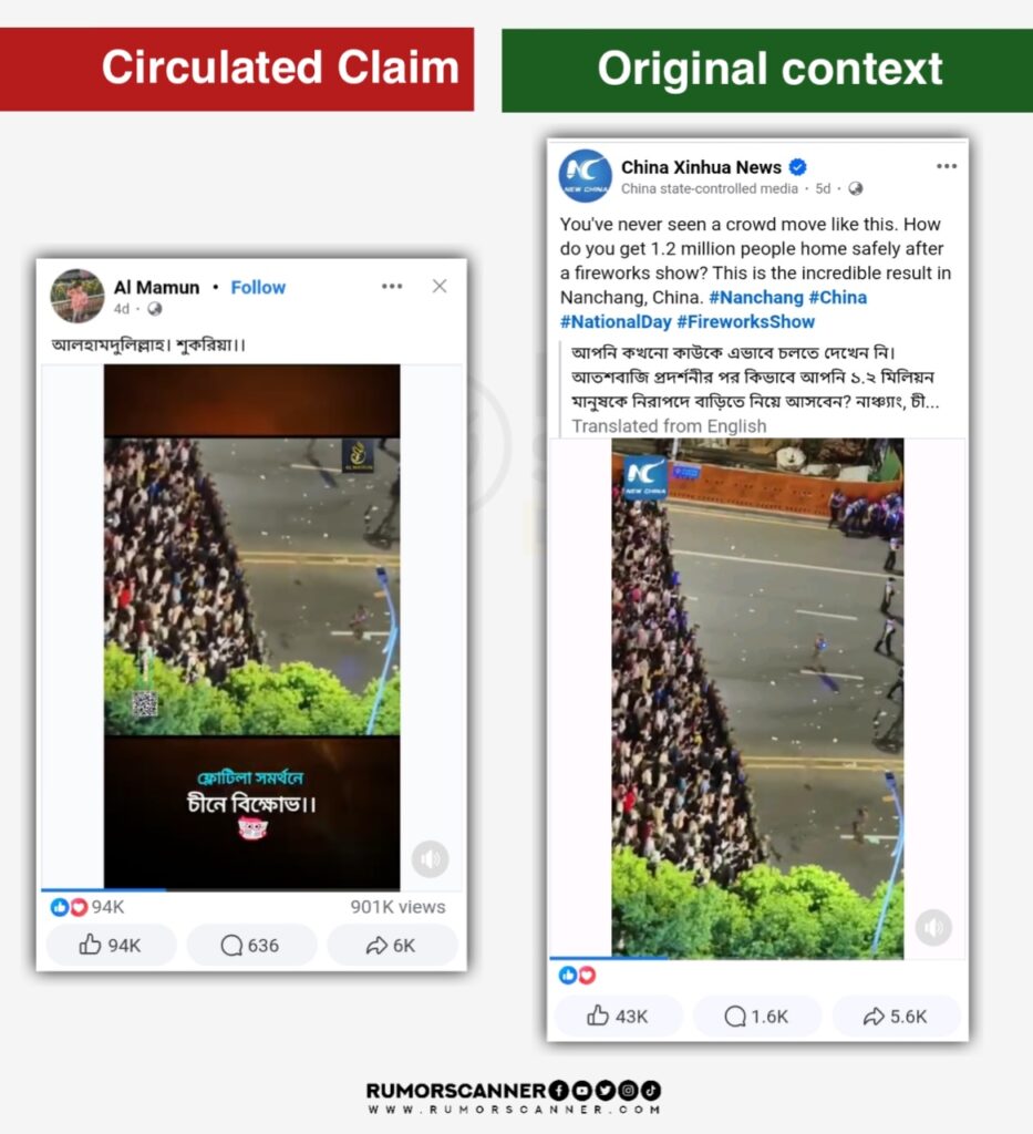 A reverse image search of several keyframes from the viral video led to a video on the Facebook page of the Chinese state media outlet ‘China Xinhua News’ on October 3. A comparison between this video and the one circulated with the claim shows a match. The caption for the video states, “You’ve never seen crowd movement like this before. How to get 1.2 million people home safely after a fireworks show? This incredible scene was witnessed in Nanchang, China. ##Nanchang #China #NationalDay #FireworksShow”