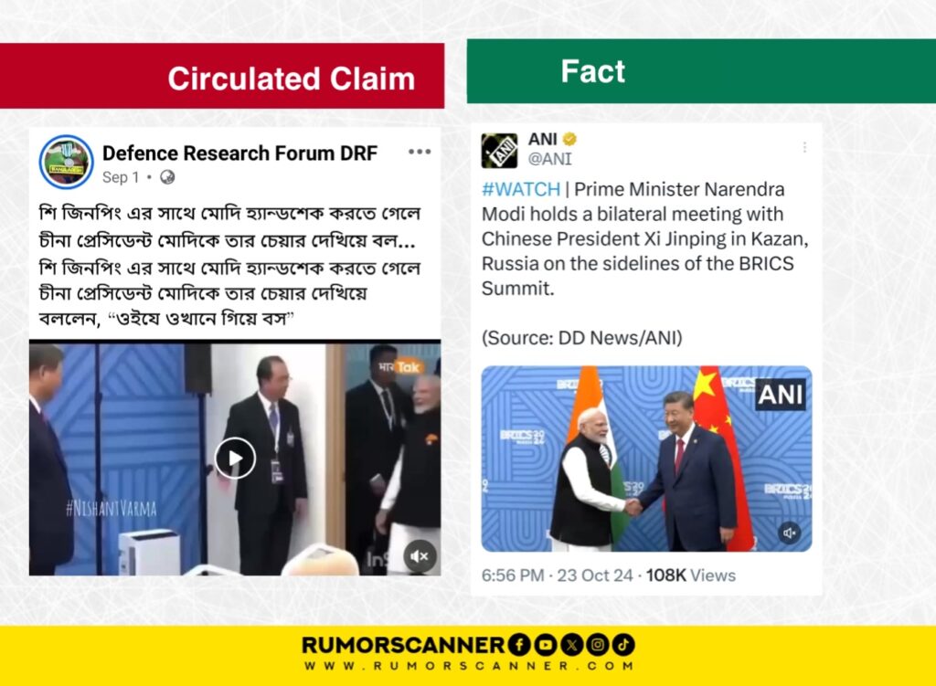 An investigation by the Rumor Scanner team found that the video is not from the recent event and the claim is false. In reality, the longer version of this video, which is from the 2024 BRICS summit, shows that as Modi extended his hand for a handshake towards Xi Jinping, Jinping gestured for Modi to move forward. Following this, the two heads of state shook hands and posed for the camera in front of their respective country’s flags.