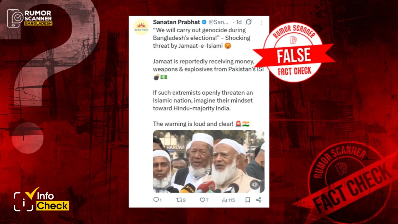 Recently, a video of a statement by the Amir of Bangladesh Jamaat-e-Islami, Dr. Shafiqur Rahman, was circulated on the social media platform X with a caption claiming: ‘”We will carry out genocide during Bangladesh’s elections!” – Shocking threat by Jamaat-e-Islami. Jamaat is reportedly receiving money, weapons & explosives from Pakistan’s ISI. If such extremists openly threaten an Islamic nation, imagine their mindset toward Hindu-majority India. The warning is loud and clear!’