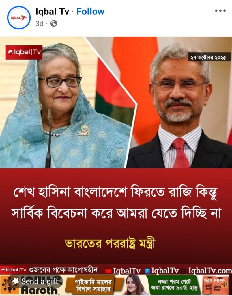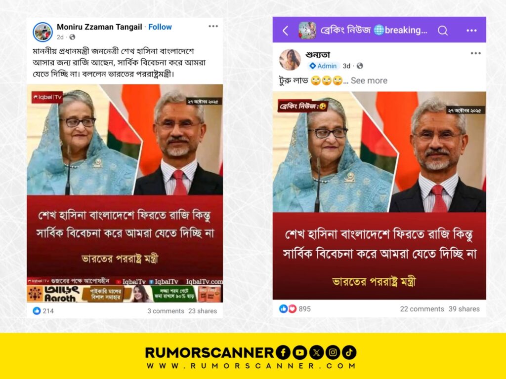 Therefore, the statement circulated, quoting Indian Foreign Minister S Jaishankar regarding former Prime Minister Sheikh Hasina’s return to the country, is false and fabricated.