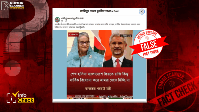 Recently, a photo card quoting the Indian Foreign Minister S Jaishankar with the headline, ‘Sheikh Hasina is ready to return to Bangladesh, but considering the overall situation, we are not allowing her to go,’ has been circulated on various platforms on the internet.