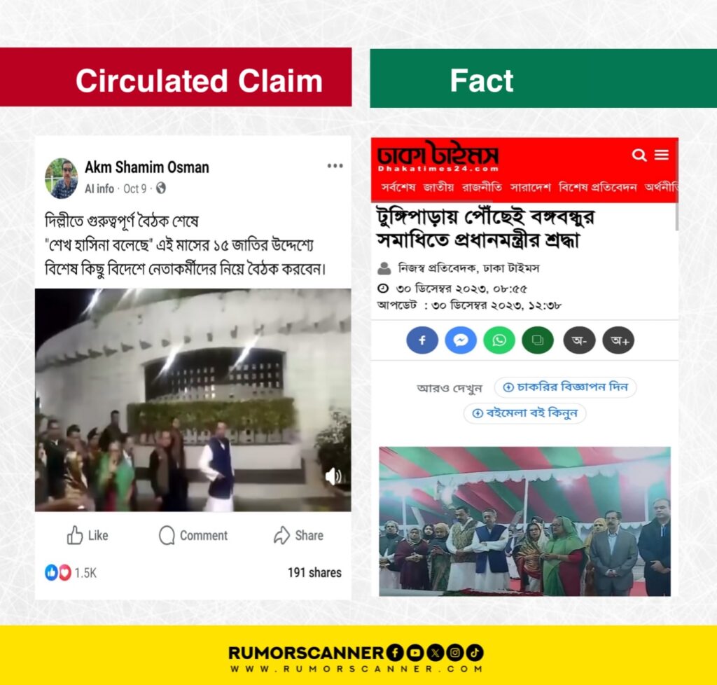An investigation by the Rumor Scanner team found that the circulated video is neither recent nor filmed in Delhi. In fact, it dates back to December 29, 2023, when Prime Minister Sheikh Hasina visited the mausoleum of Sheikh Mujibur Rahman in Tungipara, Gopalganj.