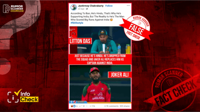 Recently, a claim has been spread on the internet stating, ‘Just Because He’s Hindu, He’s Dropped From The Squad And Jaker Ali Replaces Him As Captain Against India.’