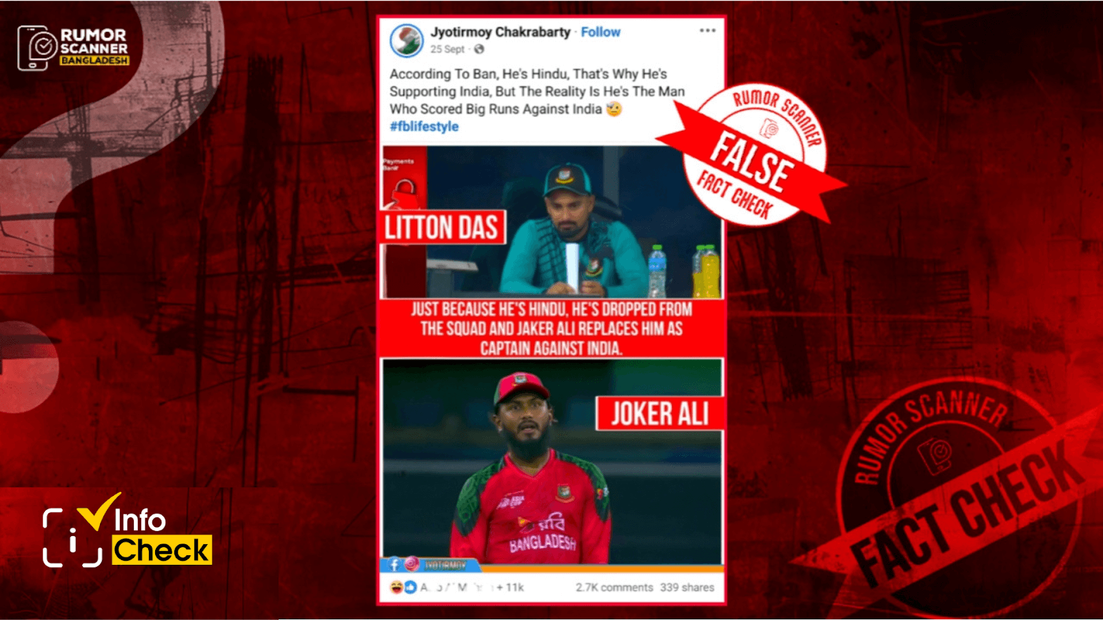 Thus, The claim that Litton Das was excluded from Bangladesh’s squad for the Asia Cup Super Four match against India due to his religion is entirely false