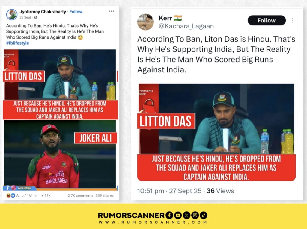 The Rumor Scanner team’s investigation found that the claim of Litton Kumar Das being dropped from the squad for the Asia Cup Super Four match against India for being a Hindu is incorrect. In reality, Bangladesh’s match against India was held on September 24. Two days prior, on September 22, Litton Das sustained a rib injury during practice. Due to that injury, Litton Kumar Das did not get a place in the playing eleven.