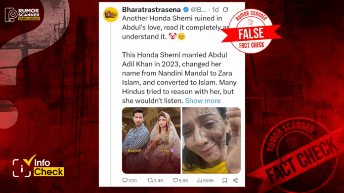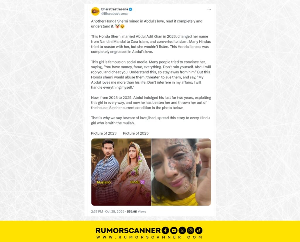 Recently, two images have been circulated side-by-side on social media claiming that the man named Abdul Adil Khan married the woman in 2023. The woman changed her name from Nandini Mandal to Zara Islam and converted to Islam. Many Hindus tried to reason with her, but she wouldn’t listen.