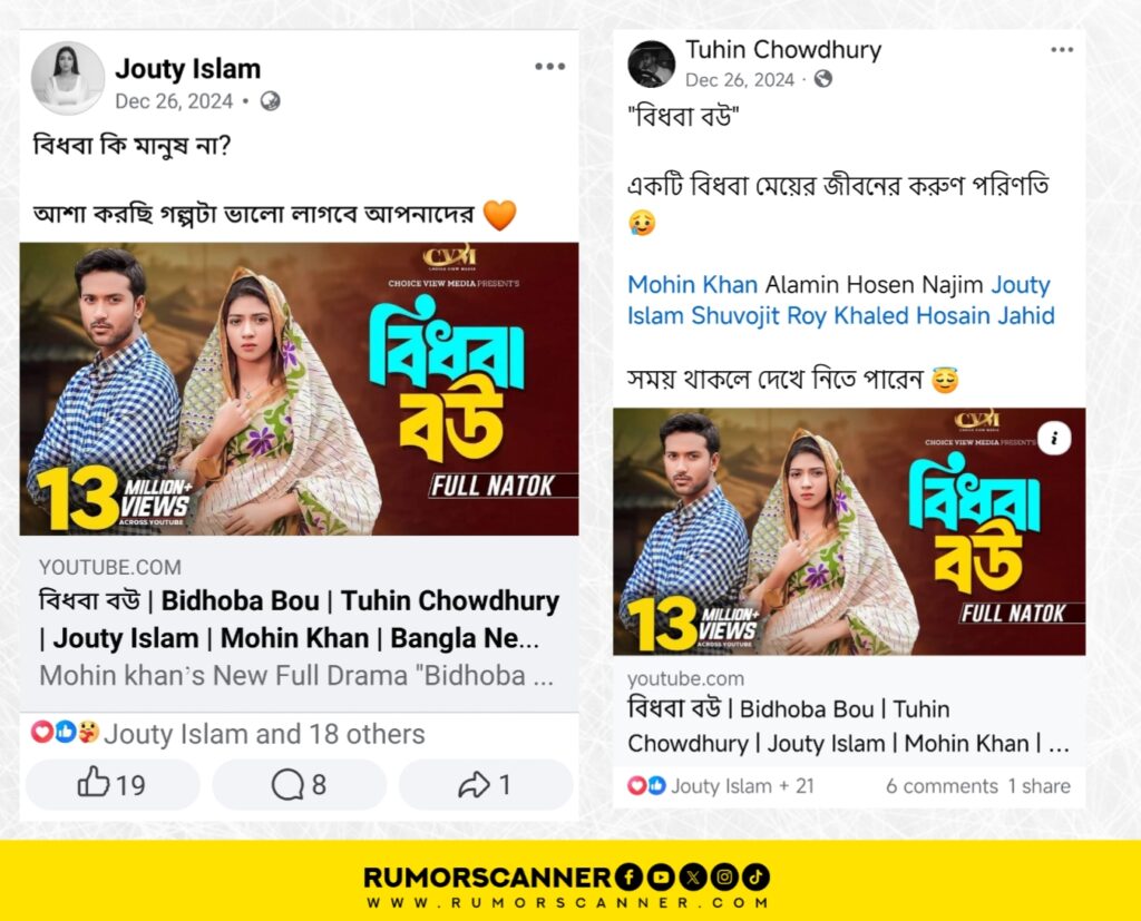 An investigation by the Rumor Scanner team found that the man mentioned in the circulating post is not named Abdul Adil Khan, nor is the woman named Nandini Mandal or Zara Islam. In reality, the poster and a makeup scene from a drama starring actor Tuhin Chowdhury and actress Jouty Islam were used to circulate this false claim.