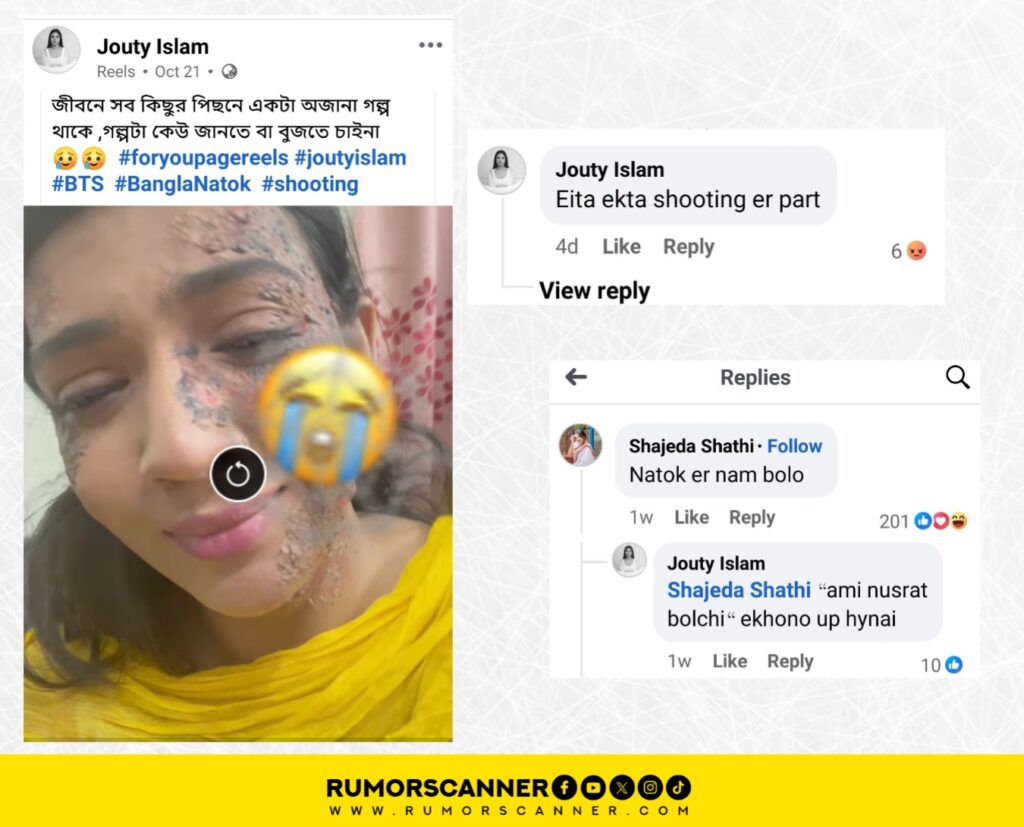 Subsequently, the second image circulated with the claim was found to match footage from a video on Jouty’s Facebook account, posted on October 21. The caption of the video includes Bengali drama and shooting-related hashtags. Jouty also commented, stating that it was a scene from a drama named Ami Nusrat Bolchi (I am Nusrat Speaking).