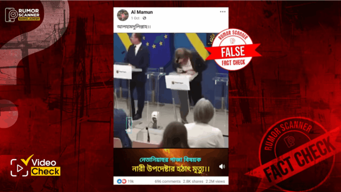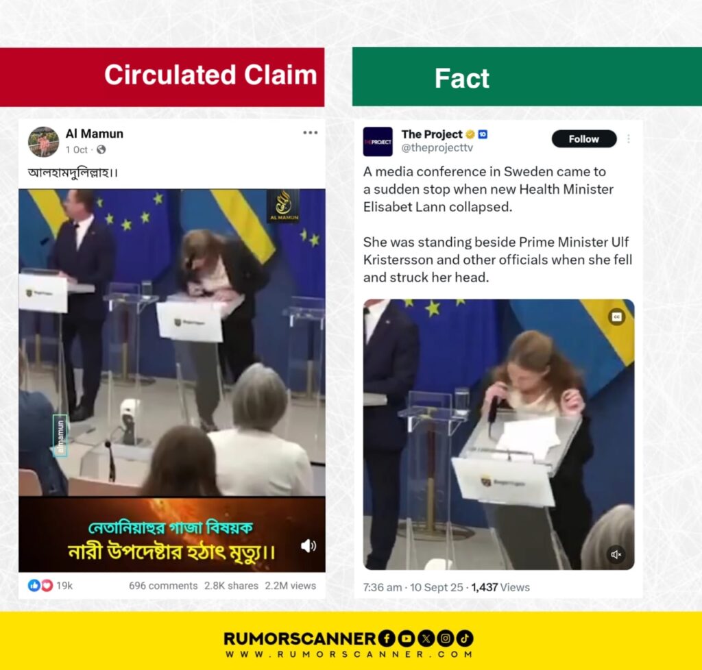 Therefore, a video showing the Swedish Health Minister suddenly falling ill during a press conference has been circulated with the claim that it shows the death of Netanyahu’s alleged female adviser on Gaza; which is false.