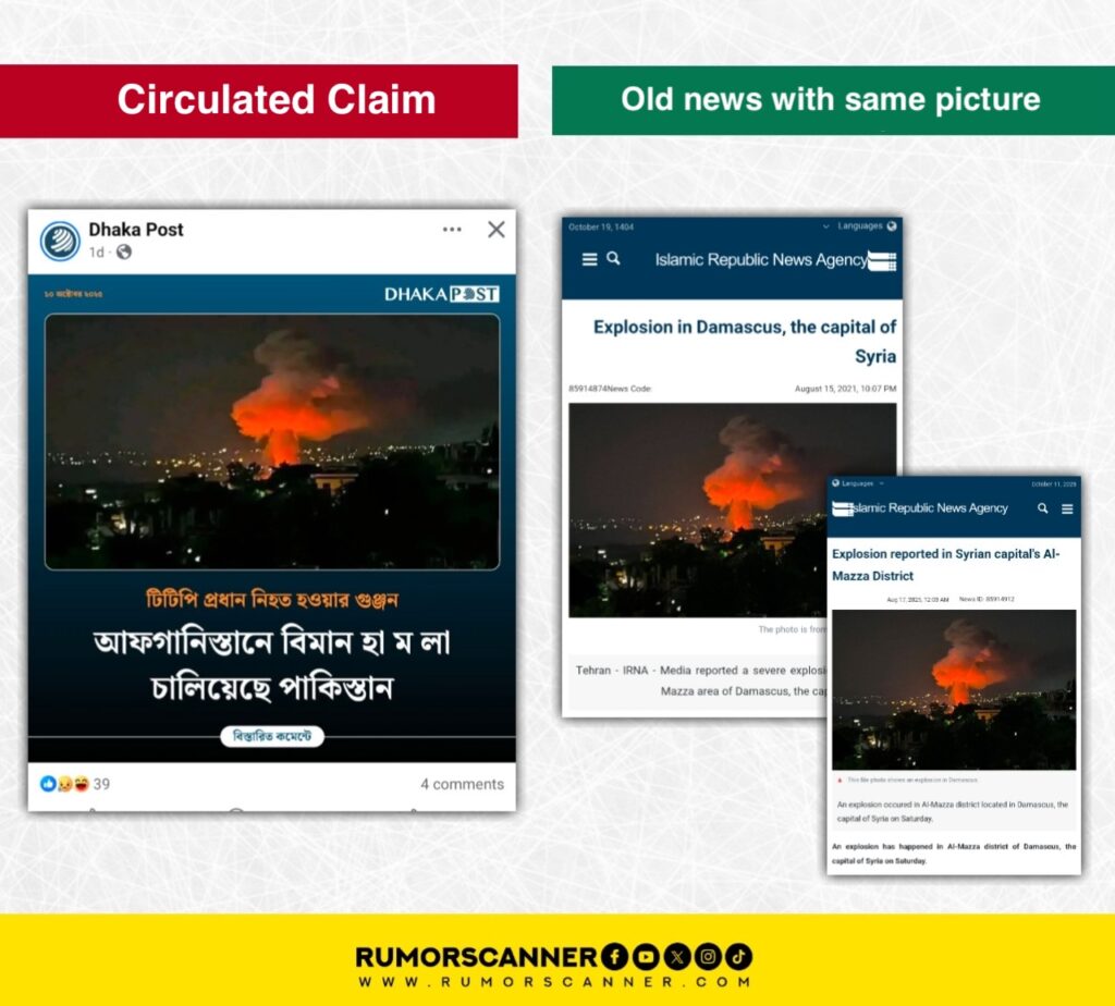 The Rumor Scanner team’s investigation found that the circulated photo has no connection with the recent explosions in Kabul, Afghanistan. In reality, the photo has been on the internet since last August. At that time, several media outlets published the photo with the claim that it was an incident of Israeli forces carrying out an attack in Damascus, Syria.