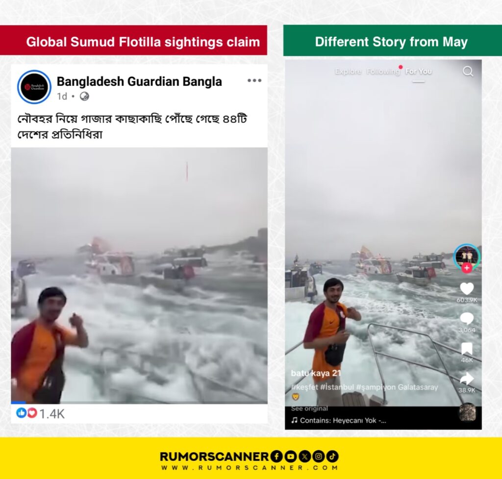 An investigation into this matter found a match between the viral video and a video published on a TikTok account named batu kaya 21 on May 26. However, the Global Sumud Flotilla’s journey began three months after this. Therefore, it is impossible for the video to be of the Global Sumud Flotilla. The caption of the TikTok video was found to use hashtags such as keşfet, İstanbul, and şampiyon Galatasaray. Here, şampiyon Galatasaray indicates that a team named Galatasaray became champion.