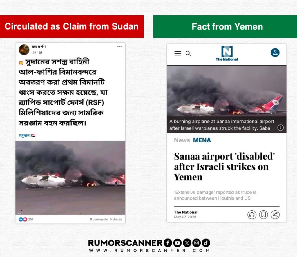 Rumor Scanner’s investigation found the same photo in a report published on May 7 of this year by the UAE newspaper The National. The description stated that this is a scene of an aircraft on fire at Sanaa International Airport following an Israeli airstrike. Al Jazeera published a video of the same incident a day earlier. Reuters reported that Israel carried out multiple attacks on the main airport in Yemen’s capital, Sanaa, in May.
