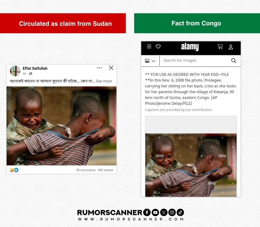 Rumor Scanner’s investigation found the same photo on the stock photography agency Alamy’s website. It is known that the photo is from 2008. It shows a child named Protegee crying while carrying her sibling on her back and looking for her parents in the village of Kiwanja, 90 km north of Goma, Eastern Congo.