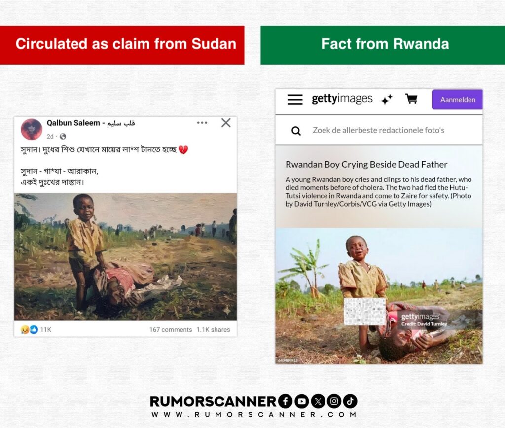 Rumor Scanner’s observation shows that the photo resembles an oil painting and has the Google Gemini AI watermark in the bottom right corner. An investigation found the original version of the image on Getty Images. The description notes that this 1994 scene shows a child crying next to his father, who died of cholera in Rwanda. This means the original photo was edited using AI to resemble an oil painting and was circulated as a recent event.
