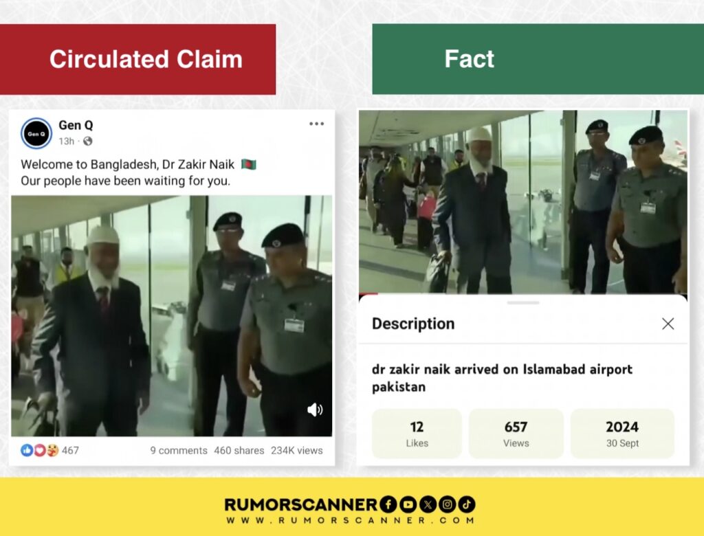 An investigation by the Rumor Scanner team found that the circulated video does not show Dr. Zakir Naik arriving in Bangladesh. In fact, Dr. Zakir Naik has never come to Bangladesh. In reality, the video shows Dr. Zakir Naik’s arrival in Pakistan on September 30 of last year, which is being circulated with the false claim.