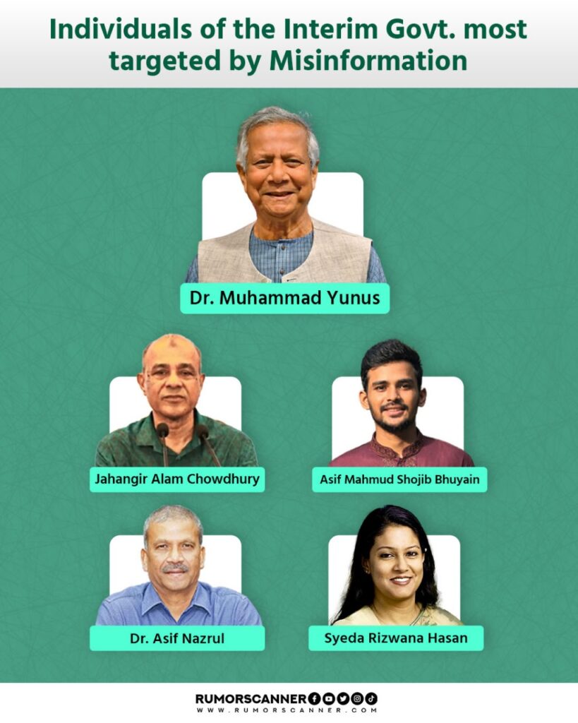 In addition to Dr. Muhammad Yunus, nine other advisers of the interim government were targeted by misinformation in the third quarter, with a total of 25 pieces identified. Among them, Jahangir Alam Chowdhury was linked to nine pieces, Asif Mahmud Shojib Bhuyain to five, Dr. Asif Nazrul to four, Syeda Rizwana Hasan to two, and Mahfuj Alam, Dr. Salehuddin Ahmed, Chowdhury Rafiqul Abrar, Faruk-e-Azam, and Bidhan Ranjan Roy Poddar were each associated with one piece of misinformation.