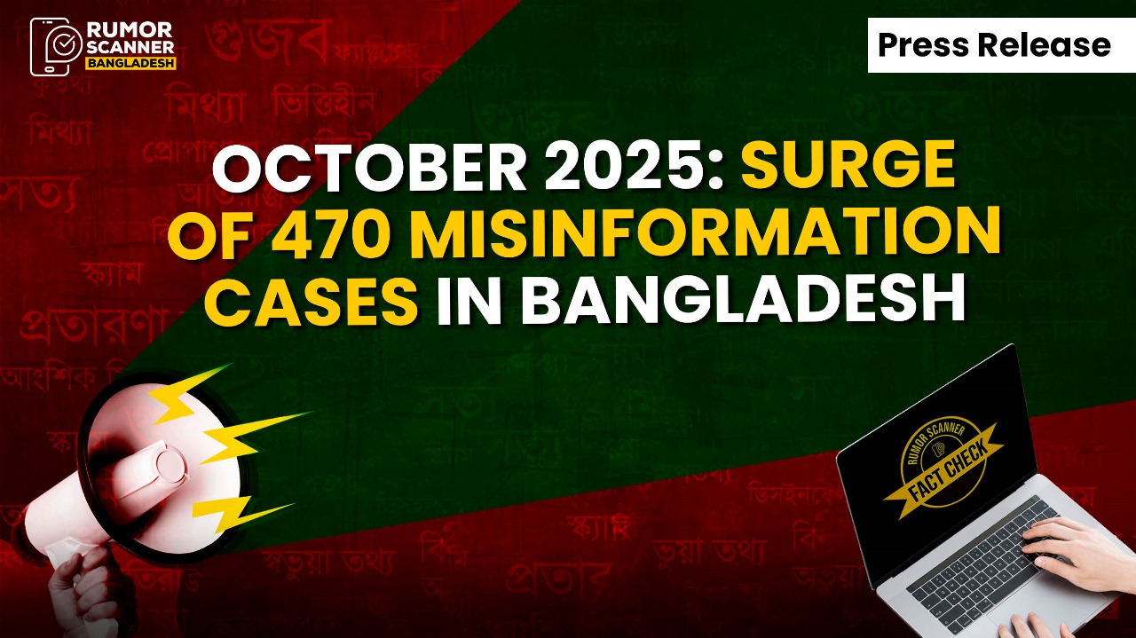 In October of this year, Bangladeshi fact-checking organization Rumor Scanner detected 470 pieces of misinformation spread on the internet. This is the highest number of misinformation pieces identified in a single month in Rumor Scanner’s history. The fact-checks for this misinformation have been published through 363 reports on Rumor Scanner’s website. Analysis shows that political issues accounted for the most misinformation spread in October (205), which is about 44 percent of the total misinformation. Additionally, 94 pieces of misinformation were detected on national issues, 85 on entertainment, 10 on religious topics, 38 on international issues, 26 on sports, four each on education and fraud, and four on other topics last month. Apart from regular fact-checks, two statistical reports and three fact files were also published in October.