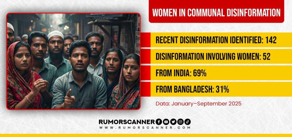 In the first eight months of this year, Rumor Scanner identified 142 pieces of communal disinformation. Among them, about 37% (52) involved women. Communal disinformation is usually spread from both Bangladesh and India. Rumor Scanner’s review found that about 69% (36) of the communal disinformation spread involving women was promoted from accounts and pages on social media with an Indian identity.