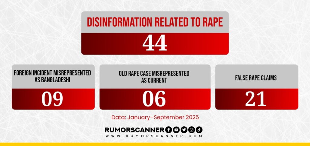 After investigating about 20% of the rape-related misinformation spread in the country, it was found that such incidents did not even happen in Bangladesh. Instead, incidents from India and other countries were claimed to be from Bangladesh. Additionally, in about 14% of the misinformation, old news, videos, and photos of rape were claimed to be from this year.