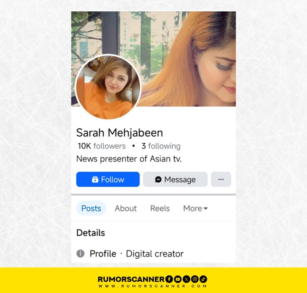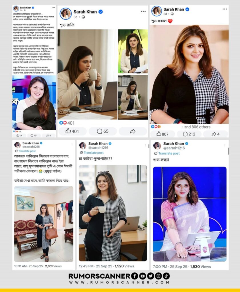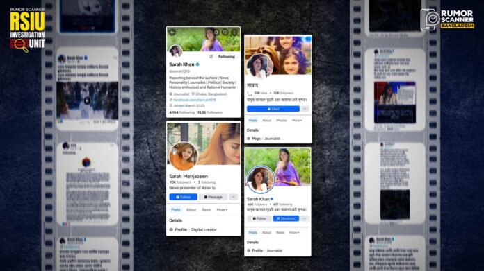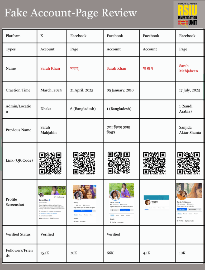 • Multiple fake IDs and pages found on Facebook and X using the name and photo of news anchor Sarah Mahjabin.