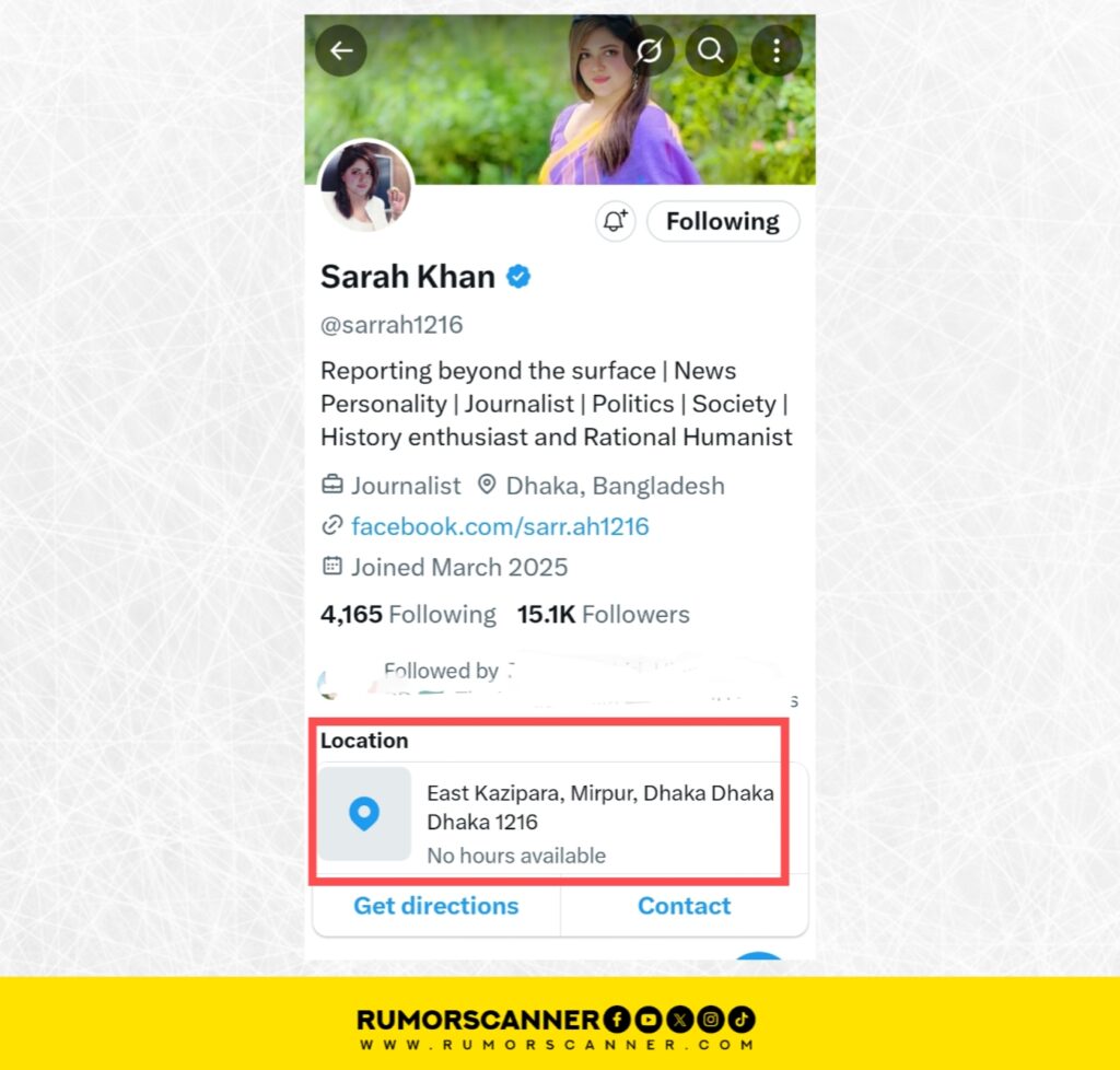 A review of the account shows that it was created in March of this year. This verified account, with over fifteen thousand followers, lists its location as South Kazipara, Mirpur, Dhaka.