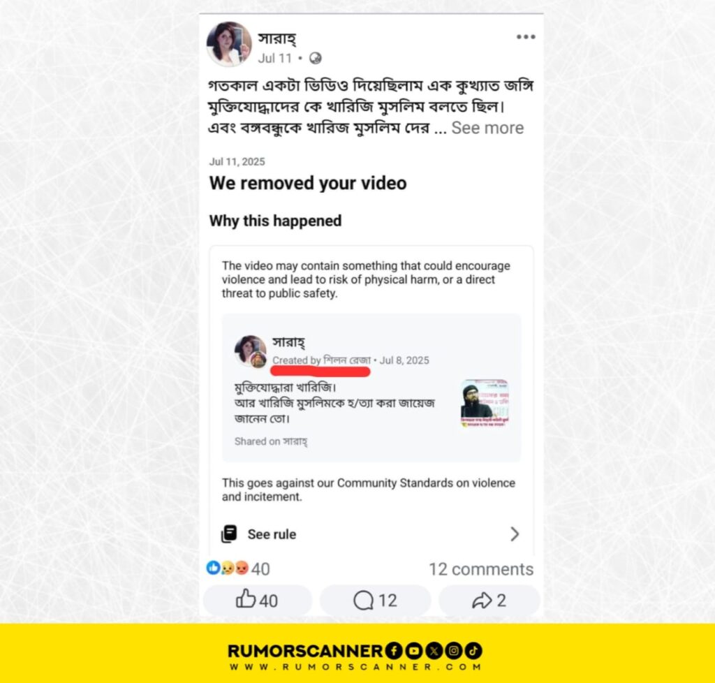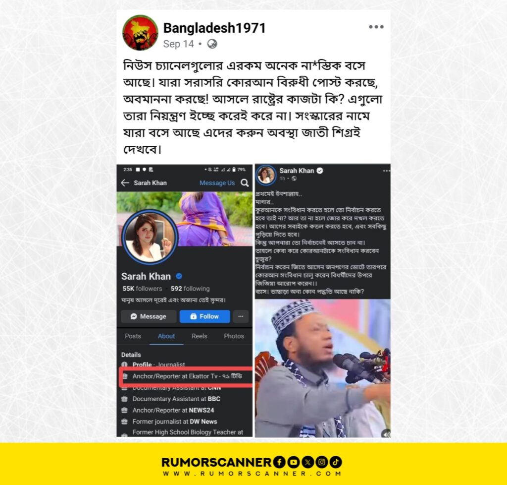 In May and June, a video of a man being hung from an excavator and beaten in India was spread on social media with the claim that it was an incident in Sitakunda, Bangladesh, and depicted a Jamaat-Shibir cadre torturing an Awami League worker. While investigating, it was found that this claim was also promoted from an X account named Sarah Khan. An investigation by the Rumor Scanner Investigation Unit has revealed that for several months, fake Facebook and X accounts have been created using the name and photo of Sarah Mehjabeen, a news anchor at the private electronic media outlet Ekattor TV. These accounts, blue-verified through paid subscriptions, are regularly used to make controversial posts and spread misinformation, putting Sarah Mahjabin’s personal security at risk. The main culprit behind these activities has also been identified.