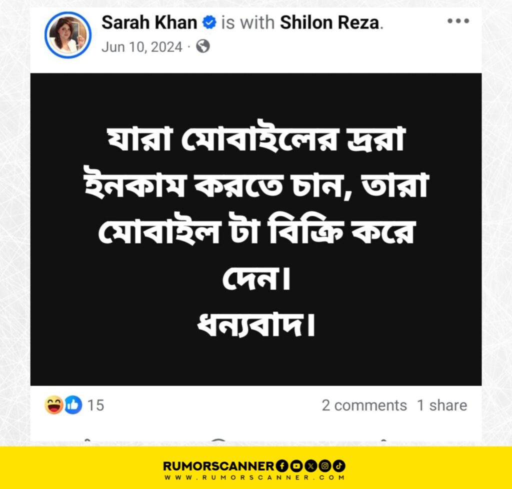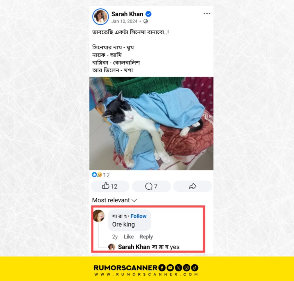 A comment on a post from this account in January 2024 caught the attention of the Rumor Scanner Investigation Unit. On a post about cats, an account named সা রা হ (Sa Ra H) made a relevant comment. A reply was also made from the Sarah Khan account. The ‘সা রা হ’ account is also active using Sarah Mehjabeen’s photo.