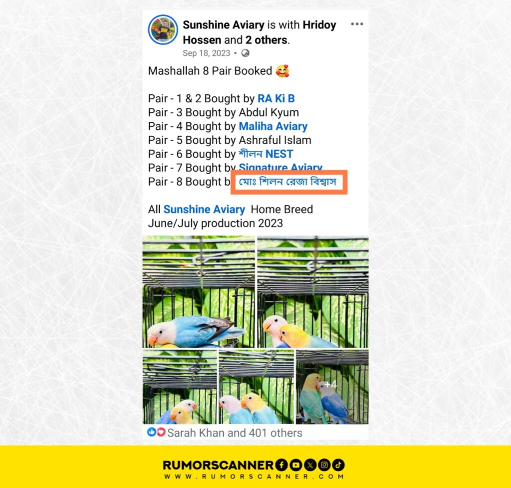 The Rumor Scanner Investigation Unit had been investigating for some time to find out who is operating these accounts and pages day after day using Sarah Mehjabeen’s name and photo. In this context, using filtering and keyword search methods on Facebook, a post from September 18, 2023, by a Dhaka-based bird-selling profile named Sunshine Aviary came to our attention. The post mentioned an account named ‘Md: Shilon Reza Biswas’. Clicking on this name now redirects to the verified account named ‘Sarah Khan’. The Rumor Scanner Investigation Unit has confirmed by analyzing some other posts from that time that the previous name of this account was ‘Md: Shilon Reza Biswas’.