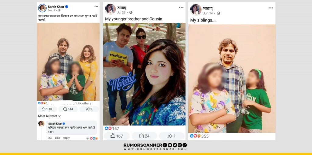 In the photos, Shilon is introduced as Sarah’s younger brother. At least two photos also show two young girls, who are introduced as Sarah’s sisters. During a conversation with the Rumor Scanner Investigation Unit, the real Sarah Mehjabeen stated that she has no younger brother. She has never seen this person. She does not know the two young girls either. She has an older brother in her family.