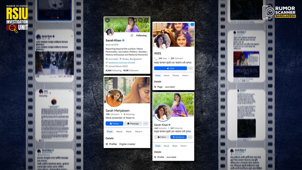 This investigation was conducted under Rumor Scanner’s specialized division, the ‘Rumor Scanner Investigation Unit’. This unit has been monitoring the activities of social media accounts and pages operating under the name and photo of news anchor Sarah Mahjabin since March. This long-term investigation, using open-source methods, has identified the main individual behind these fake accounts and pages. For the purpose of publishing this report, every fact-check report identified from these accounts between March and September of this year has been analyzed, and the activities of the accounts have been reviewed. Contact was made with the victim, and a statement was also taken from law enforcement.