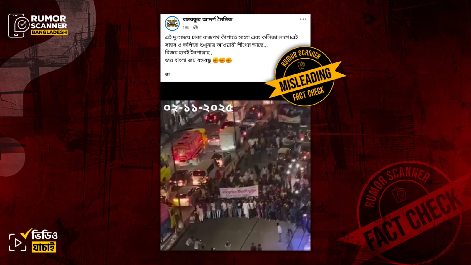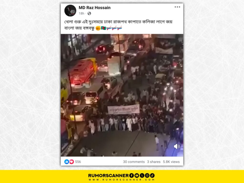 রিউমর স্ক্যানার টিমের অনুসন্ধানে জানা যায়, ভিডিওটি সাম্প্রতিক কোনো মিছিলের নয়। প্রকৃতপক্ষে, এটি ২০২৩ সালের ফেব্রুয়ারিতে বাংলাদেশ আওয়ামী যুবলীগের আয়োজিত মিছিলের পুরোনো দৃশ্য।