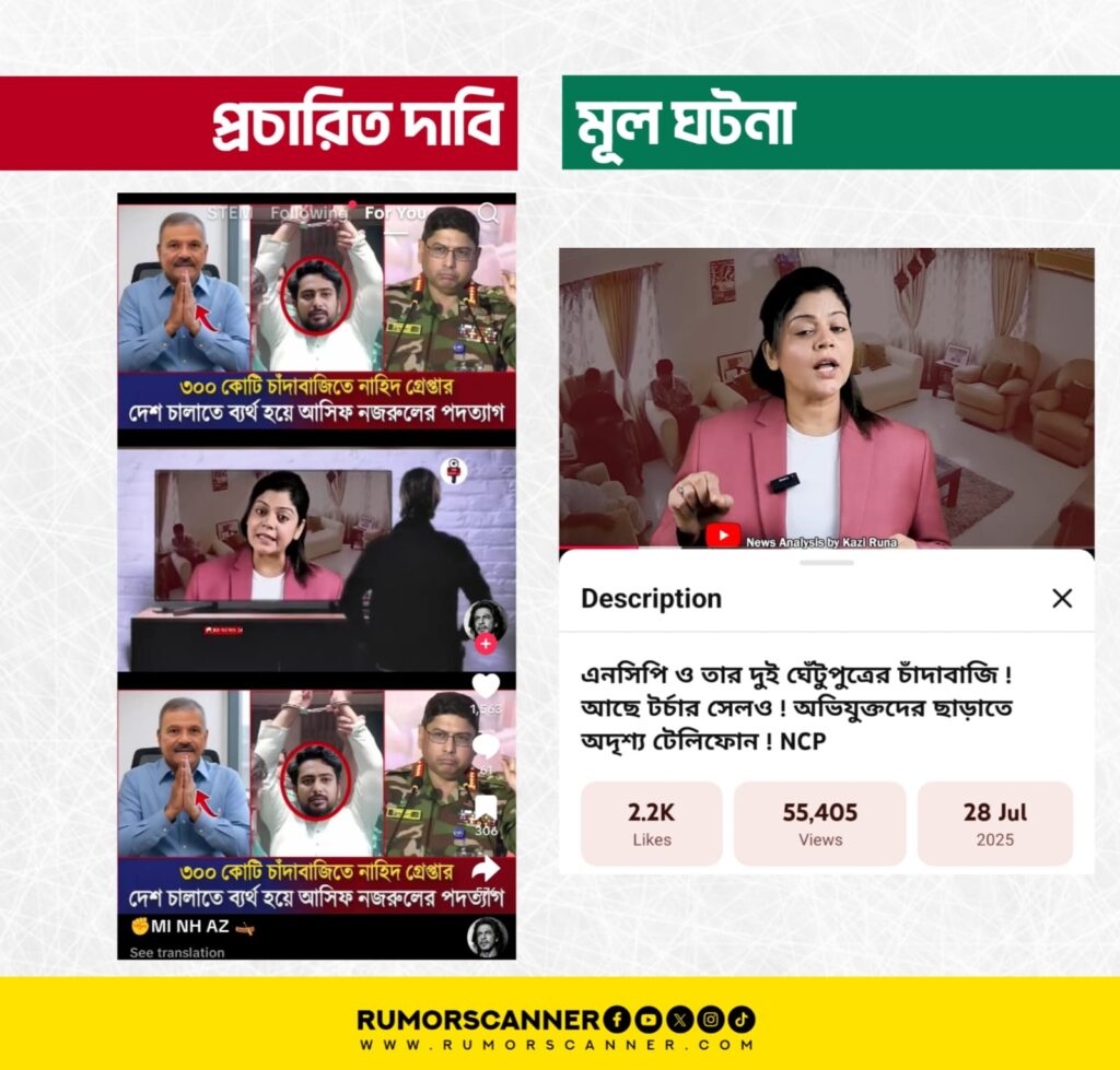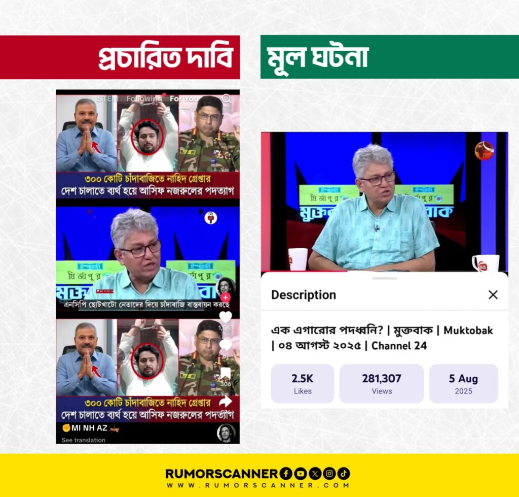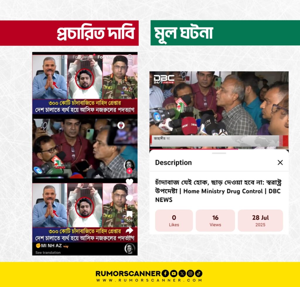 সম্প্রতি, ‘৩০০ কোটি চাঁদাবাজিতে নাহিদ গ্রেপ্তার দেশ চালাতে ব্যর্থ হয়ে আসিফ নজরুলের পদত্যাগ’ শীর্ষক দাবিতে একটি ভিডিও সামাজিক যোগাযোগ মাধ্যমে প্রচার করা হয়েছে।