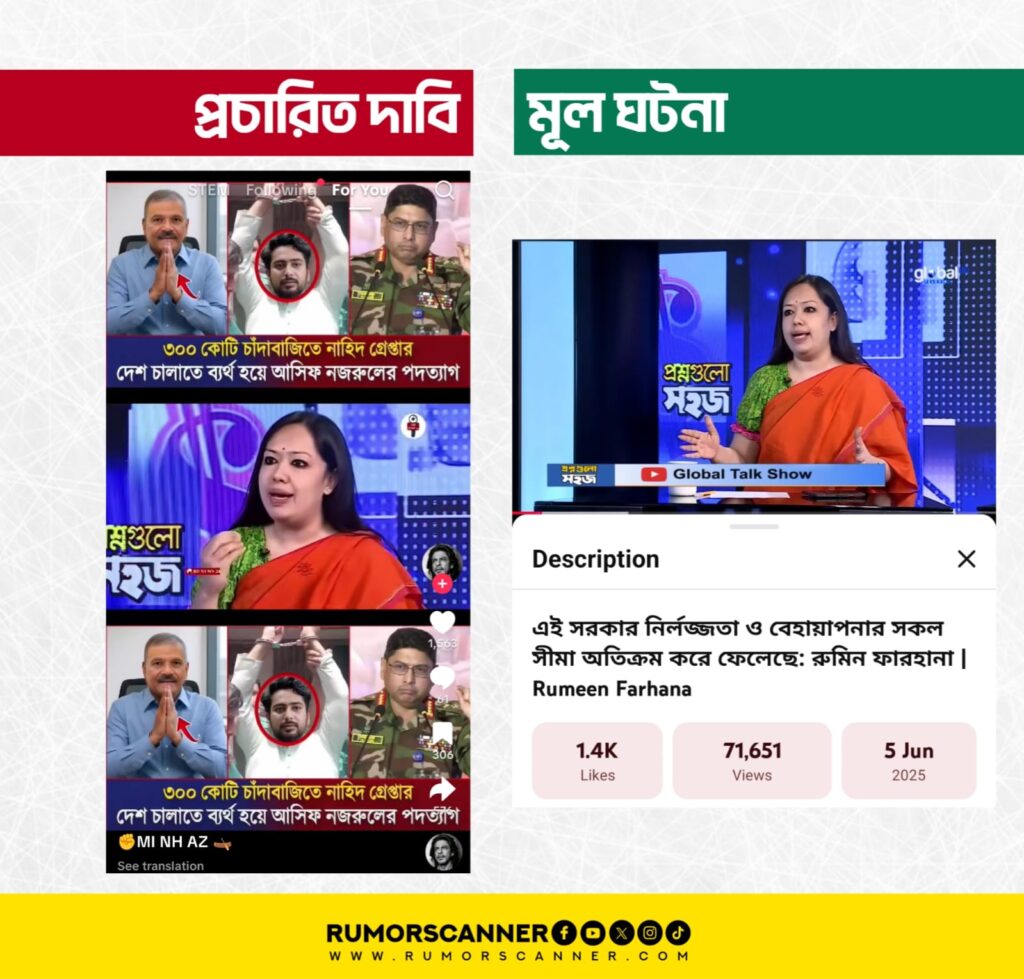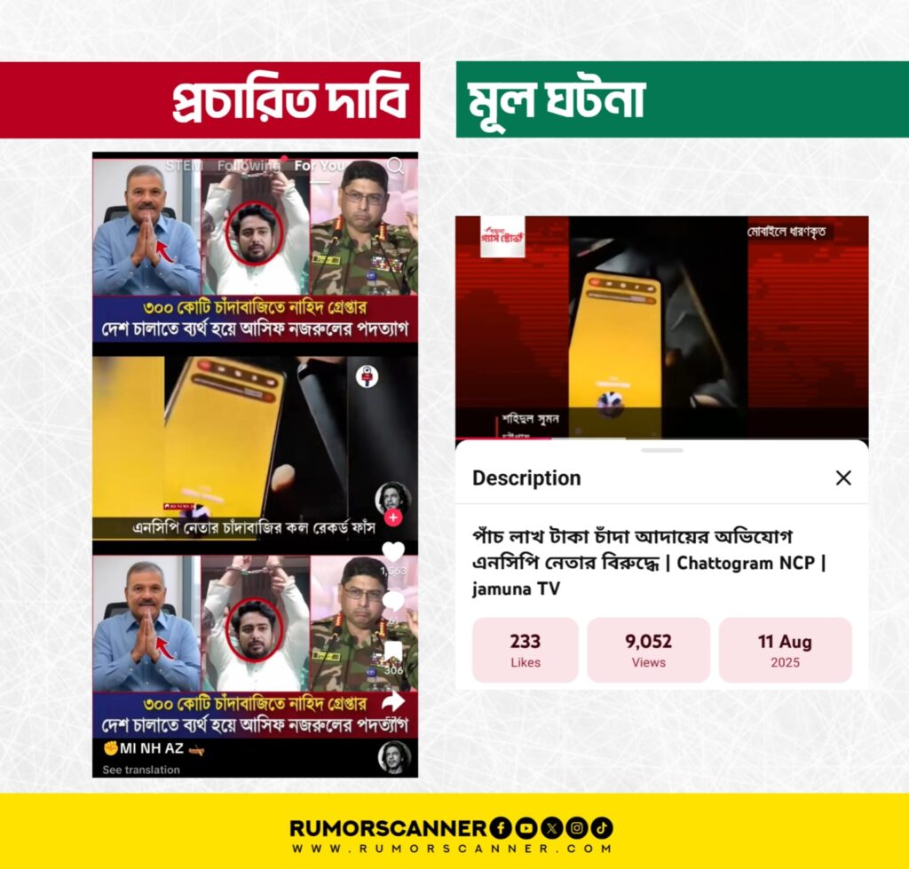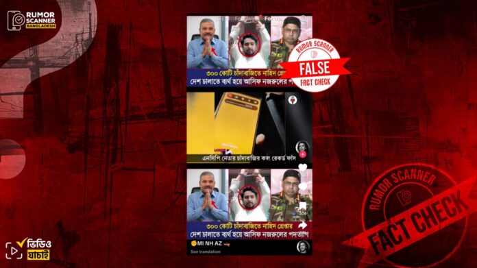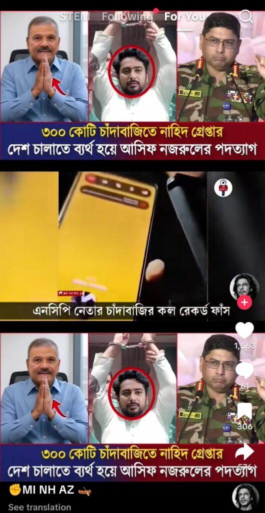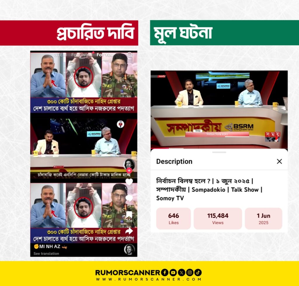 সম্প্রতি, ‘৩০০ কোটি চাঁদাবাজিতে নাহিদ গ্রেপ্তার দেশ চালাতে ব্যর্থ হয়ে আসিফ নজরুলের পদত্যাগ’ শীর্ষক দাবিতে একটি ভিডিও সামাজিক যোগাযোগ মাধ্যমে প্রচার করা হয়েছে।