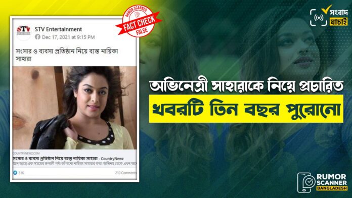 রিউমর স্ক্যানার টিমের অনুসন্ধানে দেখা যায়, নায়িকা সাহারার সংসার ও ব্যবসা প্রতিষ্ঠান নিয়ে ব্যস্ত থাকার খবরটি সাম্প্রতিক সময়ের নয় বরং তিন বছর পুরোনো।