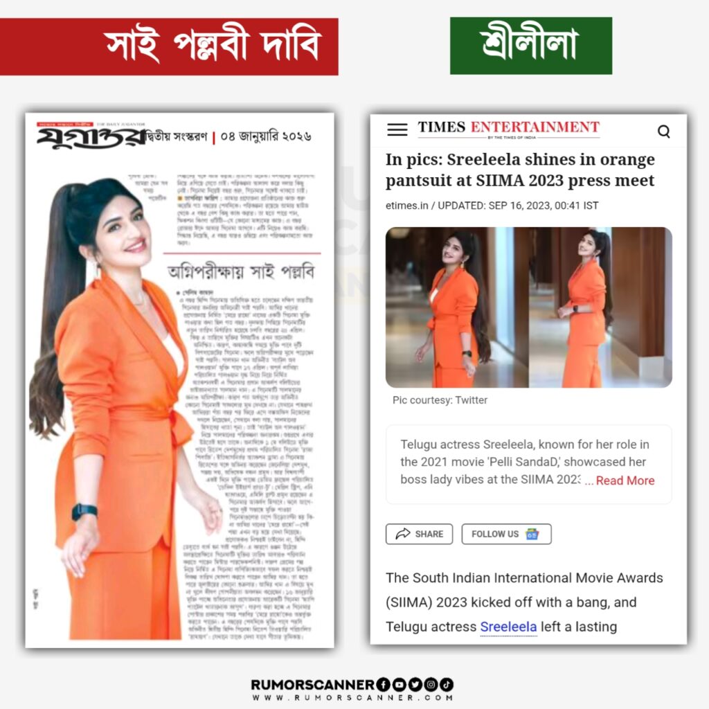 আলোচিত ছবির বিষয়ে অনুসন্ধানে ভারতীয় গণমাধ্যম ‘দ্যা টাইমস অফ ইন্ডিয়া’র ওয়েবসাইটে ২০২৩ সালের ১৬ সেপ্টেম্বরে প্রকাশিত একটি প্রতিবেদন পাওয়া যায়। প্রতিবেদনে আলোচিত দাবিতে প্রচারিত ছবিরও সংযুক্তি পাওয়া যায়। ছবিগুলো সম্পর্কে ‘টাইমস অফ ইন্ডিয়া’র প্রতিবেদনে বলা হয়, এগুলো দুবাইয়ে অনুষ্ঠিত ২০২৩ সালের সাউথ ইন্ডিয়ান ইন্টারন্যাশনাল মুভি অ্যাওয়ার্ডস (এসআইআইএমএ)-এর সংবাদ সম্মেলন অনুষ্ঠানে তেলুগু অভিনেত্রী শ্রীলীলার ছবি।