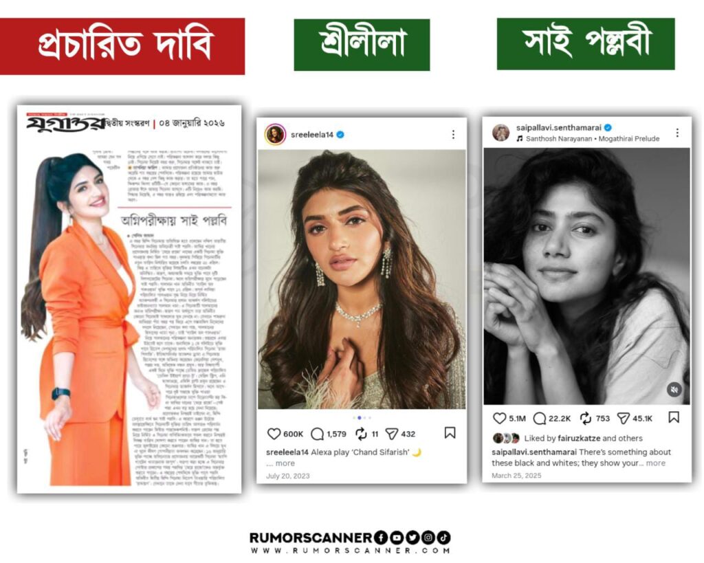 রিউমর স্ক্যানার টিমের অনুসন্ধানে জানা যায়, প্রচারিত ছবিটি ভারতীয় অভিনেত্রী সাই পল্লবীর নয় বরং, ভারতীয় আরেক অভিনেত্রী শ্রীলীলার ছবিকে সাই পল্লবীর দাবিতে প্রচার করা হয়েছে।