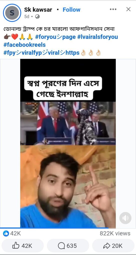 সুতরাং, এআই দিয়ে তৈরি ভিডিওকে মার্কিন প্রেসিডেন্ট ডোনাল্ড ট্রাম্পকে আফগানিস্তানের সেনার চড় মারার আসল ভিডিও দাবিতে প্রচার করা হয়েছে; যা মিথ্যা।
