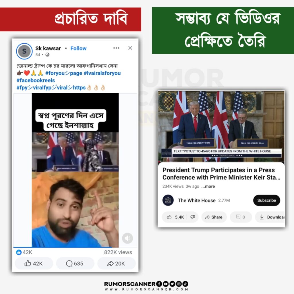 পরবর্তীতে আলোচিত দাবিতে প্রচারিত ভিডিওটির একাধিক কি-ফ্রেম নিয়ে রিভার্স সার্চ করলে ভিডিওটি আসল হওয়ার সপক্ষে নির্ভরযোগ্য সূত্রে কোনো তথ্যপ্রমাণ পাওয়া যায়নি। অনুসন্ধানে মার্কিন প্রেসিডেন্টের অফিশিয়াল বাসভবন ও কর্মক্ষেত্র ‘দ্যা হোয়াইট হাউজ’ এর ইউটিউব চ্যানেল ও ‘DWS News’ নামক একটি ইউটিউব চ্যানেলে গত ১৮ সেপ্টেম্বরে মার্কিন প্রেসিডেন্ট ডোনাল্ড ট্রাম্প ও যুক্তরাজ্যের প্রধানমন্ত্রী কিয়ার স্টারমারের একটি প্রেস কনফারেন্সের ভিডিও পাওয়া যায়। ভিডিওটিতে প্রদর্শিত দৃশ্যের সাথে আলোচিত দাবিতে প্রচারিত ভিডিওটির দৃশ্যের মিল পাওয়া যায়। আলোচিত দাবিতে প্রচারিত ভিডিও ও উক্ত প্রেস কনফারেন্স দুই জায়গাতেই ডোনাল্ড ট্রাম্পের সামনে ‘Tech Prosperity Deal’ও লেখা দেখতে পাওয়া যায়। কিন্তু, উক্ত প্রেস কনফারেন্সে আলোচিত ঘটনার অনুরূপ কোনো ঘটনা ঘটতে দেখা যায়নি।