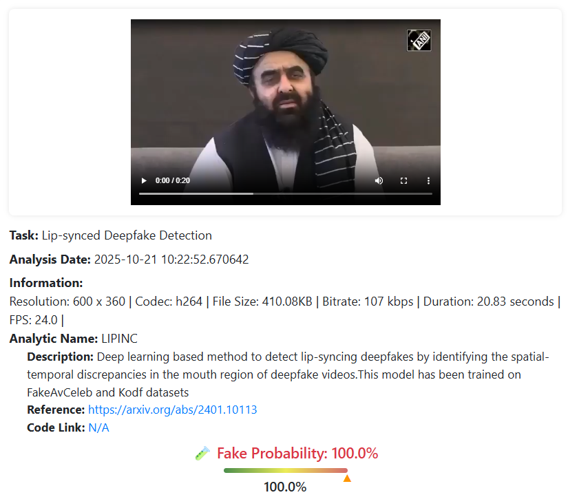 পরবর্তীতে, রিউমর স্ক্যানার এআই-জনিত কনটেন্ট শনাক্তকারী টুল ‘ডিপফেক-ও-মিটার’-এর ‘LIPINC (2024)’ মডেলের মাধ্যমে ভিডিওটি বিশ্লেষণ করে। এই মডেলের ফলাফলে দেখা যায়, ভিডিওটি এআই দিয়ে তৈরির সম্ভাবনা ১০০ শতাংশ।