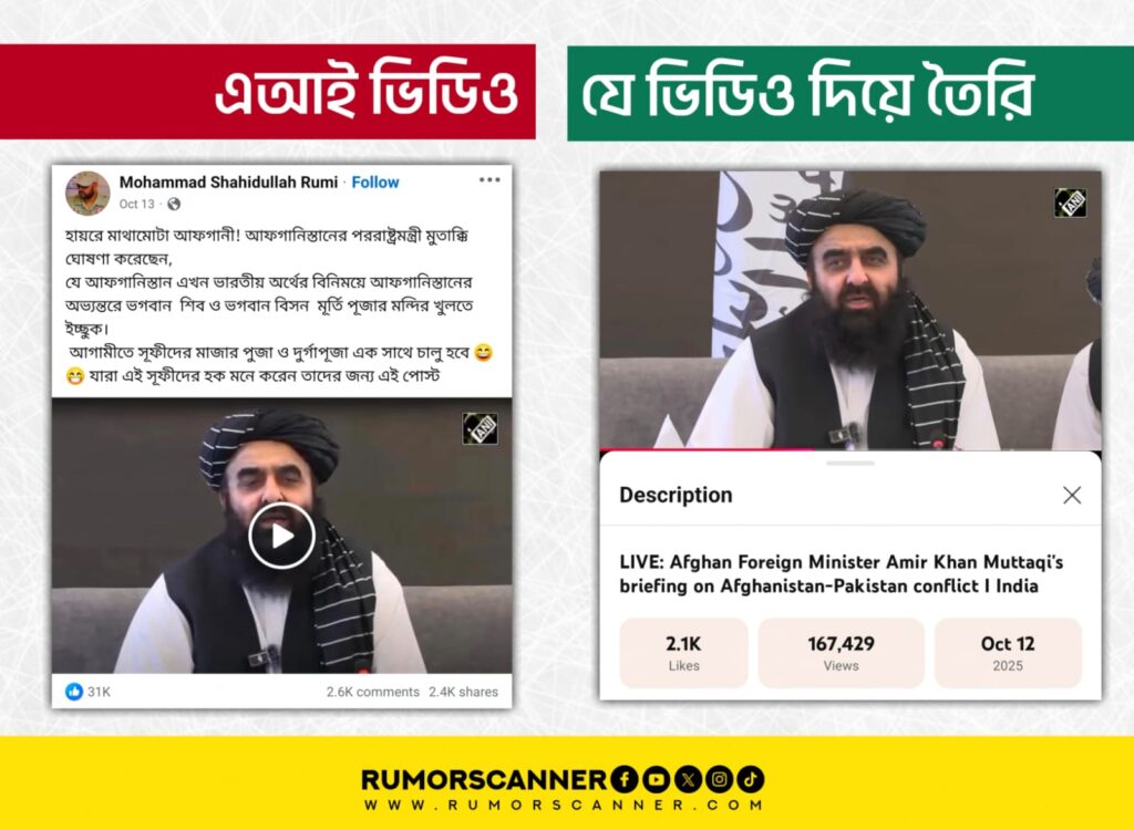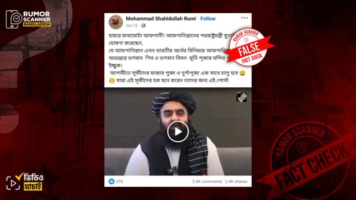 এই ভিডিওর মাধ্যমে দাবি করা হচ্ছে, মুত্তাকি ভারতের আর্থিক সহায়তার বিনিময়ে আফগানিস্তানে হিন্দু দেবতা শিব ও বিষ্ণুর মন্দির নির্মাণের ইচ্ছা প্রকাশ করেছেন।