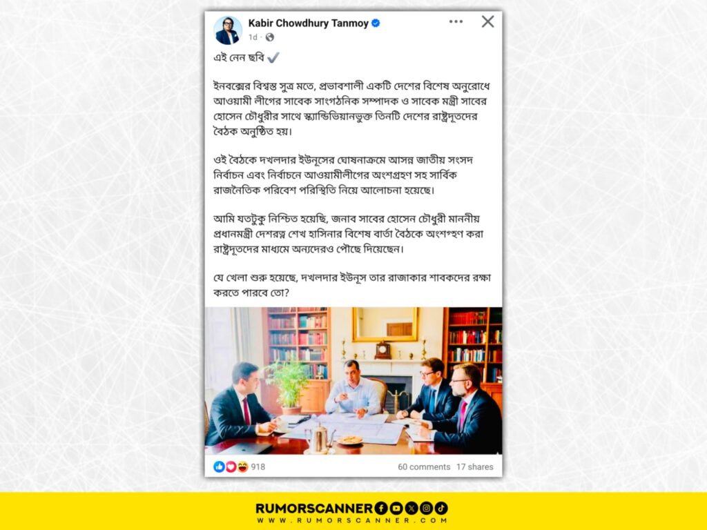 এই বিষয়ে অনুসন্ধানে আলোচিত ছবিটি কোনো বিশ্বস্ত সূত্রে পাওয়া যায়নি। সাবের হোসেন চৌধুরীর বাসায় তিন রাষ্ট্রদূতের বৈঠকের দাবিতে প্রথম সংবাদটি প্রকাশ করে কালবেলা, তবে গণমাধ্যমটি সেই সংবাদের সঙ্গে আলোচিত ছবিটি প্রকাশ করেনি। বরং তারা চার জনের আলাদা আলাদা ছবি কোলাজ আকারে প্রতিবেদনে যুক্ত করেছে। একইভাবে বাংলাদেশ আওয়ামী লীগ বা সাবের হোসেন চৌধুরীর ফেসবুক পেজেও ছবিটি পাওয়া যায়নি। অর্থাৎ, আলোচিত ছবিটির উৎস কোনো বিশ্বাসযোগ্য মাধ্যম নয়।